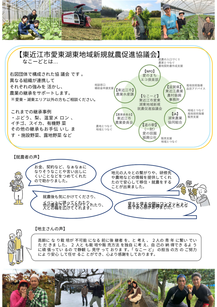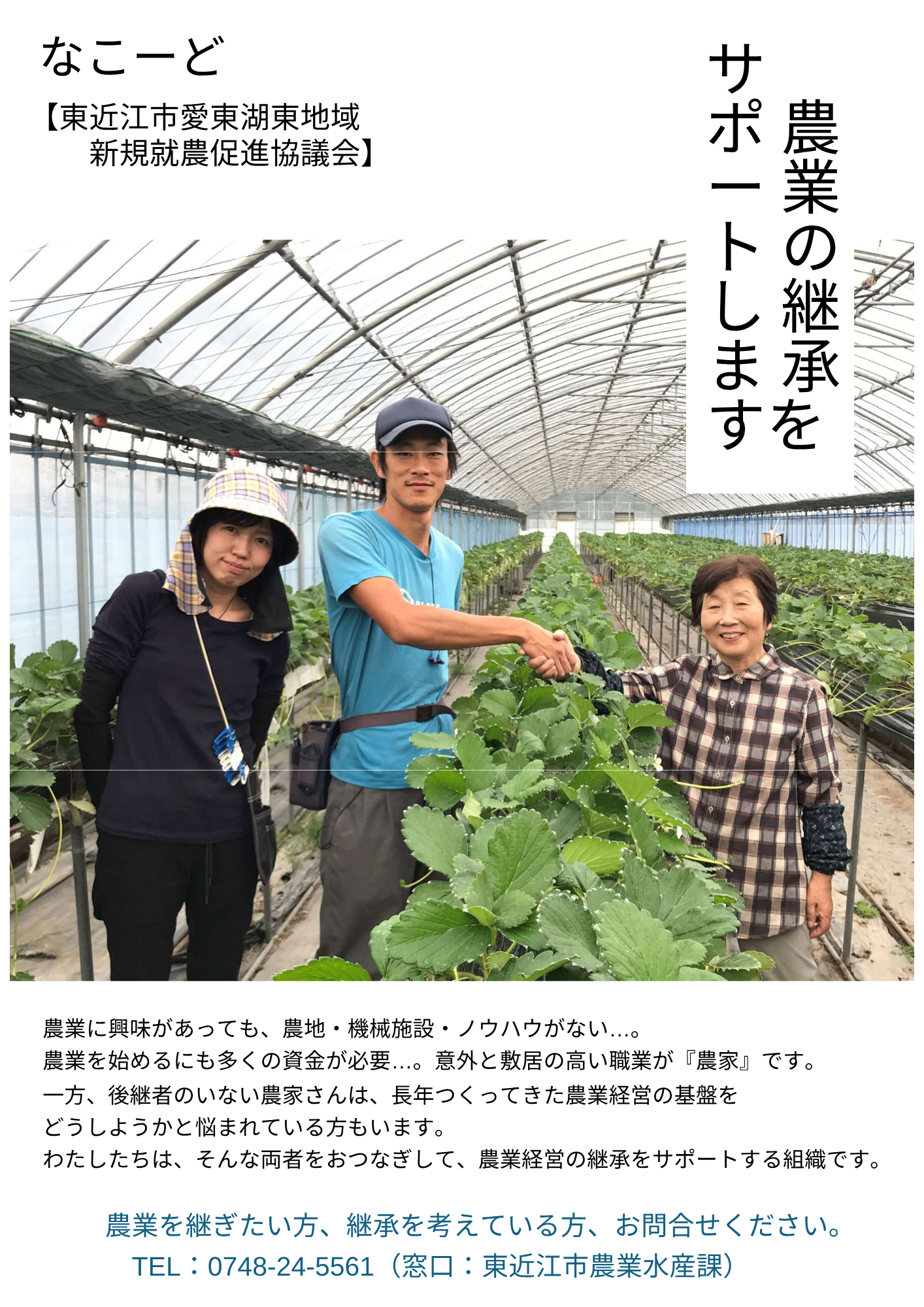 愛のまちエコ俱楽部では、「なこーど(東近江市愛東・湖東地域新規就農促進協議会)」の一員として、新規就農・農地継承の支援を行っています。